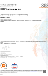 ESS Technology fulfills international quality management standards such as ISO 9001 certification and requires all of its suppliers to be ISO 9001 and/or ISO/IATF 16949 certified.